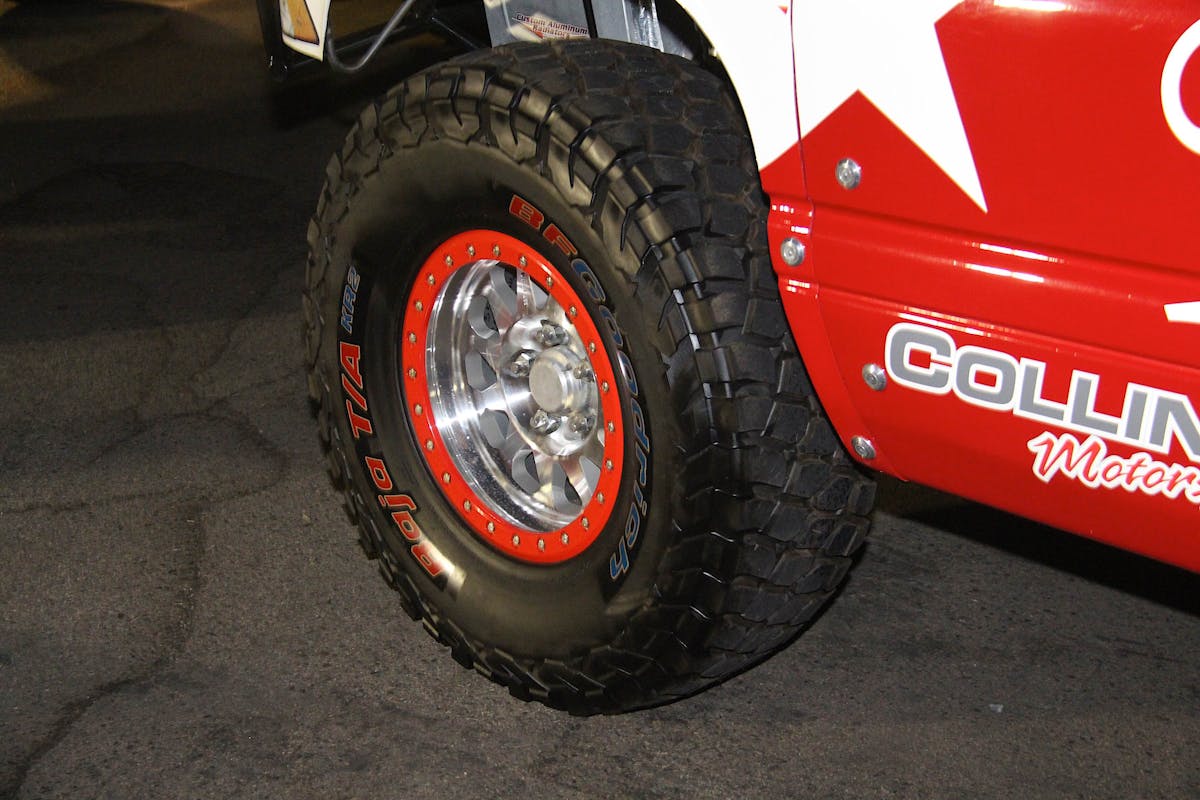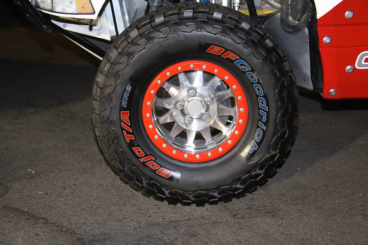 Our first pick of the three happens to be the most colorful. These particular BF Goodrich Baja T/A tires are sized in 37×12.5R17, which is a great size for a prerunner or rock crawler. The tires themselves have a very aggressive sidewall and almost had a retro look with the tread pattern, which happens to go great with the polished center of the Method MR101 wheels have a somewhat retro vibe to them. On the outside of those MR101 wheels are real beadlocks painted in red, none of that fake stuff. On the side of the tire is a blue and red BF Goodrich logo which matches the red paint of the bead lock very well.