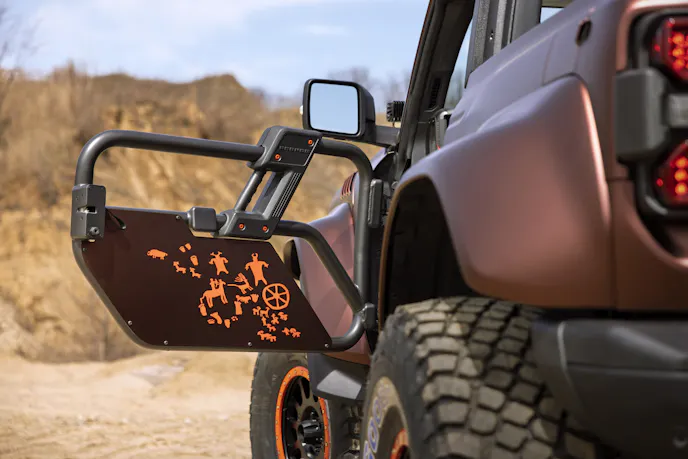 Ford’s Bronco Color and Materials Design team, led by Kellie Walters and Brad Fishkin, took inspiration for the vehicles’ wrap from Moab’s iconic red slick rock. The matte finish protective film used is similar to the factory-applied matte clear film that is available on production Bronco four-door models. And the combination of metallic shades and the matte finish are reminiscent of Ford’s Shelter Greed color found on Raptor.