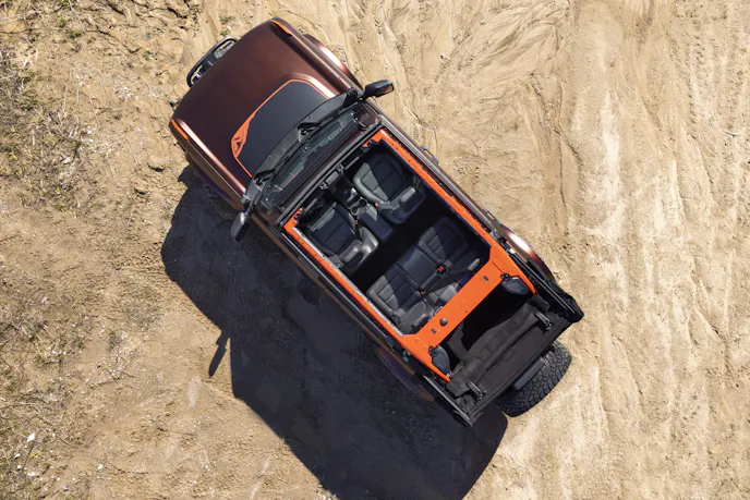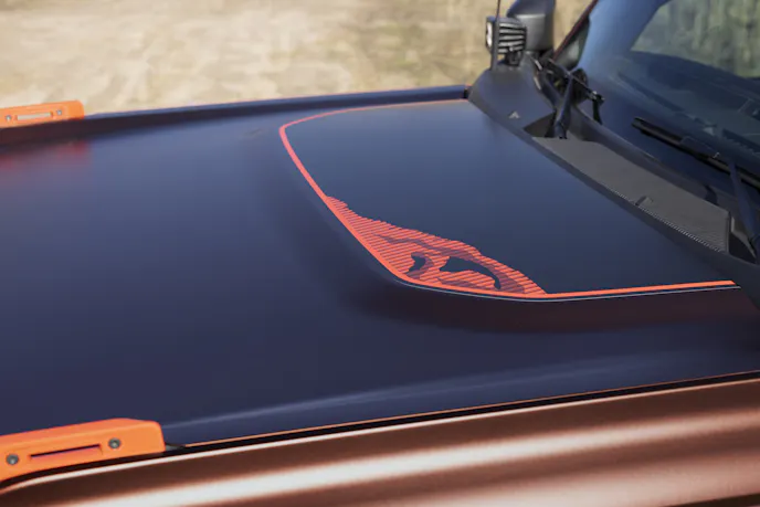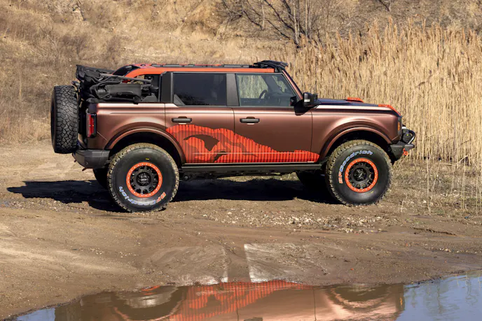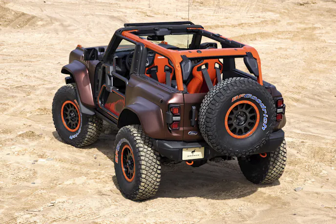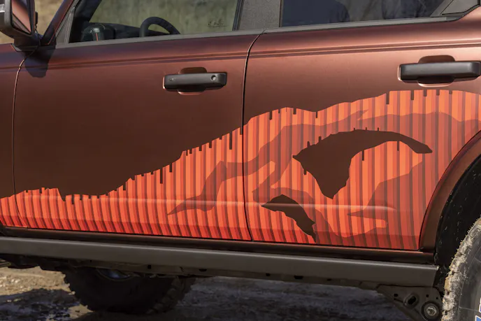 Ford’s Bronco Color and Materials Design team, led by Kellie Walters and Brad Fishkin, took inspiration for the vehicles’ wrap from Moab’s iconic red slick rock. The matte finish protective film used is similar to the factory-applied matte clear film that is available on production Bronco four-door models. And the combination of metallic shades and the matte finish are reminiscent of Ford’s Shelter Greed color found on Raptor.