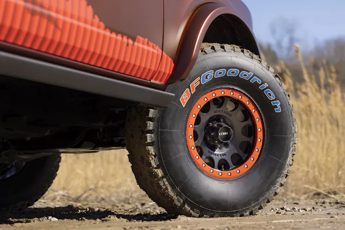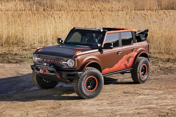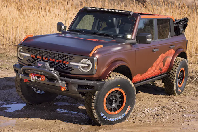 The first of Ford’s two Bronco concepts is based on a Bronco Badlands four-door. Envisioned as the ultimate all-around off-road vehicle, this Bronco is ideal for carting five friends around the trails of Moab. Ford fit this Bronco with 17-inch beadlock-capable Method wheels and 37-inch BFGoodrich All-Terrain T/A KDR2 tires. A 2-inch ReadyLift SST lift kit provides space for the larger rolling stock. A Ford Performance Parts Warn ZEON 10-S recovery winch is attached to the front bumper and a Rigid LED light bar sits atop the windshield. Rigid A-pillar lights are also featured along with a power soft-top.