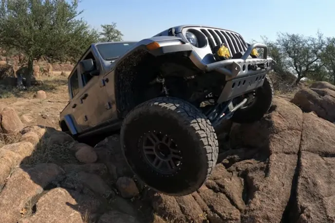 The video shows off the rugged durability of the Gladiator’s impressive mods. The Yokohama Geolandar X-AT 37-inch tires don’t just look badass, they do a fantastic job of gripping the boulders and allowing the Jeep Gladiator to do some impressive climbing and maneuvering over intimidating terrain. It helps that the two hosts are hardcore Jeep enthusiasts, because they focus on capturing great footage in close-ups of exactly what you want to see, including pausing to capture 360-degree footage and undercarriage shots.
