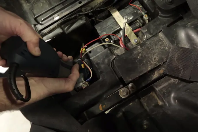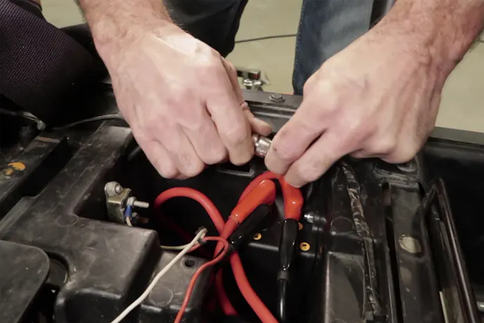 Ray decides to put the switch near the steering wheel, offering easy access to the driver. He drills one more hole into the battery box and feeds the switch’s cable through. Here, we see the special locking connector made for the switch, designed to stay together even during harsh off-road driving. Back at the steering wheel, Ray inserts the switch’s mounting bracket, which has been bent 90 degrees to fit into the small space. He then installs the switch, wires up the negative battery terminal, installs the cable hook, and that completes the job.