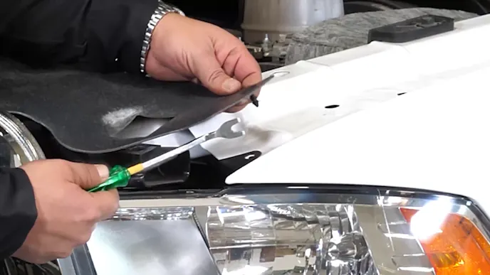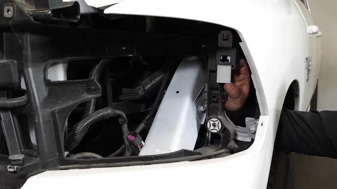 Next, you’ll remove a pair of 10mm bolts on the headlights. However, you also have other clips you must remove before it will come out. One of those clips you need to work with is in the front wheel well. To reach it, you’ll need to remove an access panel that’s just in front of the front tire. What you’re looking for is a clip that you push up to release the headlight on each side. From there, you rock the headlight until it pops out to remove it. You’ll then want to remove each connector for the headlight and running/signal lights.