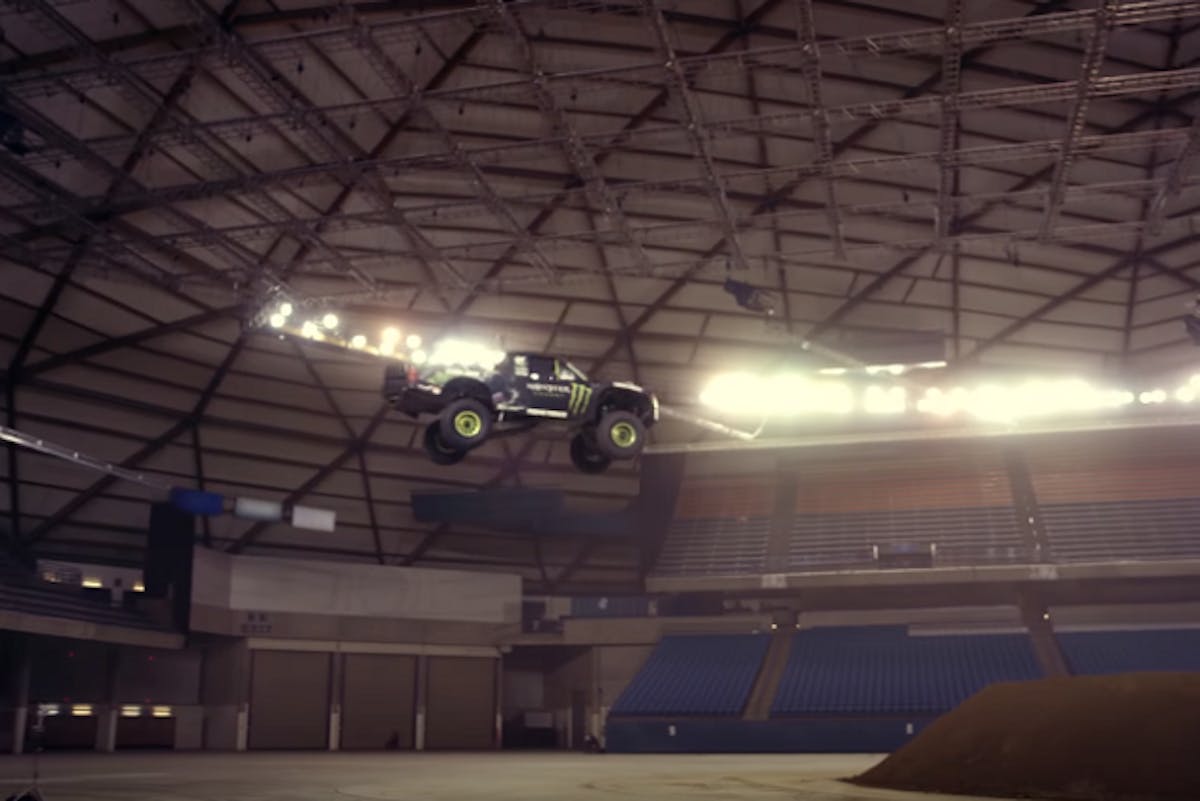 Or at least, that’s how the video begins. Soon after the chase gets going, the actual forest gives way to an empty concrete jungle, where Sasquatch has fled and where there are a multitude of more options for cool camera angles. The sleepy, hilly city is the perfect playground for Baldwin’s trophy truck, allowing him to get maximum air while tearing through the wide, empty interactions.