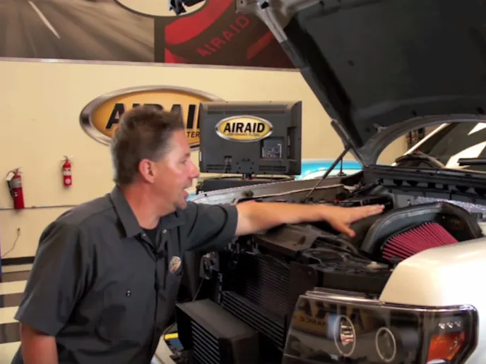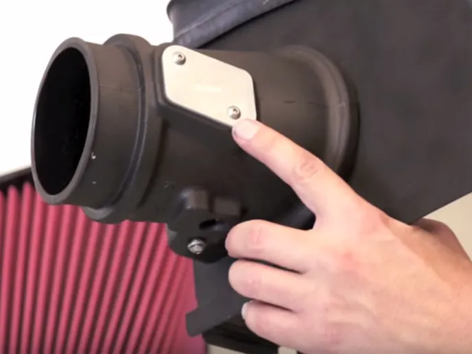 McGee breezes through the installation in a matter of 15 minutes: disconnecting the battery, unplugging the MAF sensor, loosening the intake tube, removing the upper half of the intake box, and finally the stock intake tube. The MAF sensor plugs into one of the two provided spots (accounting for differences in the 2011-14 setups) on the AIRAID part, and a provided block-off plate will stay on to prevent contamination and leaking in the other spot.