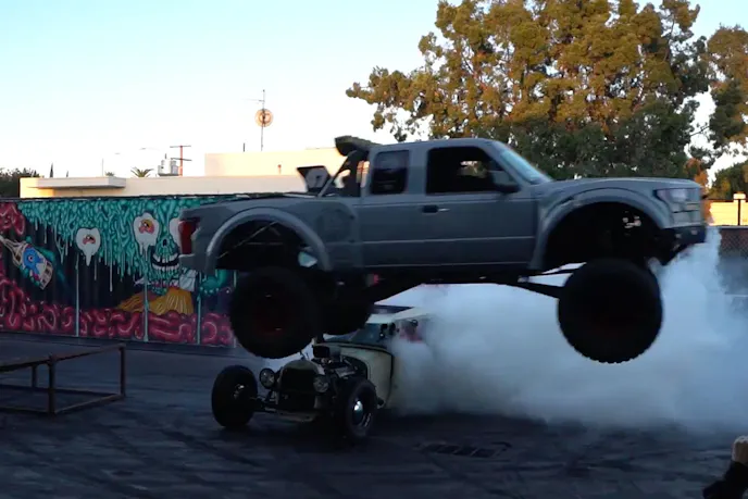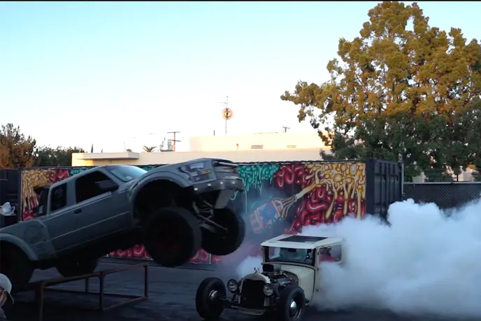 Eventually, the Hoonigans wanted to jump their friend’s rat-rod truck, so they did. After figuring out Darren couldn’t physically jump the tallest part of the rat-rod, they settled on jumping the nose of it. Of course, the rat-rod had to be doing a burnout at the same time to make it even cooler.