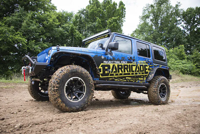 PTF 6Barricade Off-Road supplied the front bumper and rear bumper with tire carrier, fender flares, and rock sliders to allow this Jeep that extra touch of ruggedness. The lighting on the Jeep was completely overhauled as well as it now includes two 2.5-inch LED spotlights, two 3-inch square LED off-road lights and a 50-inch double row LED light bar. Project Trail Force has had even the headlights upgraded to KC HiLiTES 7inch LED headlights.