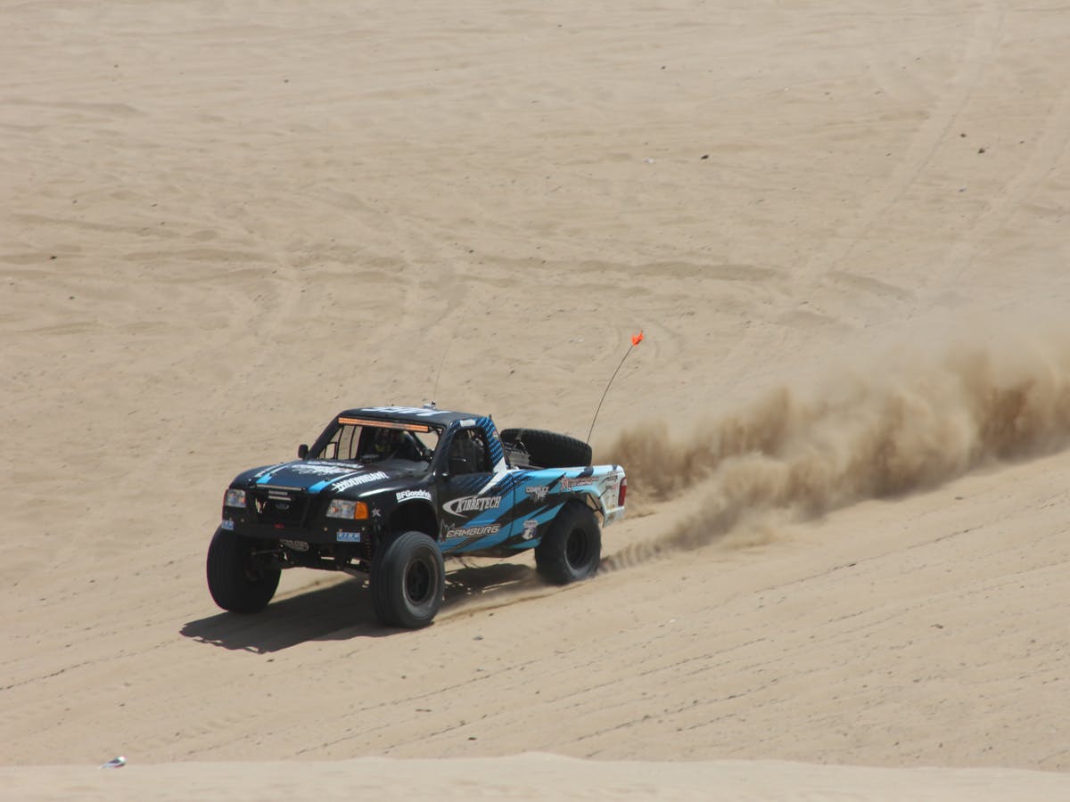 Everyone stood on the sidelines, entertained by the pre-runners as preparations for the officially-measured hucks began. Amid the anticipation, Shocker Motorsports decided the crowd was in need of a jolt and accordingly hauled out its monster truck to kick up dunes on its own.