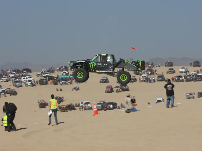 Baldwin’s crew was able to save the day by getting a new wiring harness and installing it just in time for the 4:00 p.m. deadline. Baldwin then threw everything his Monster Energy Trophy Truck had at the hill, and once the sand had settled, it had flown a jaw-dropping total of 425ft.