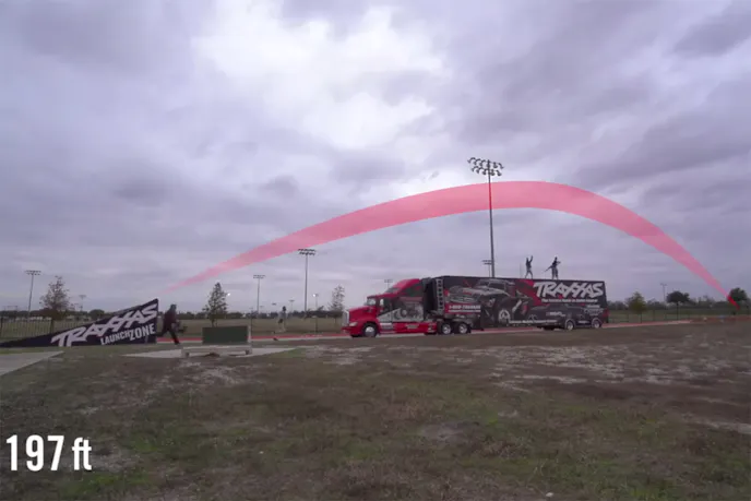 The end to all of this awesomeness is a world record attempt jump with an R/C car. Using a Traxxas-provided ramp labeled “Launch Zone” and a full-scale transport 18-wheeler, the guys lay it all on the line. Full-throttle, the car goes up and over the semi truck, landing on a dirt ramp on the other side (on all four wheels, no less). Once the dust has settled, it’s revealed that the car went a full 197 feet. Not too shabby, if you ask us.
