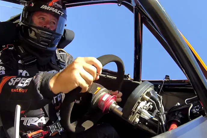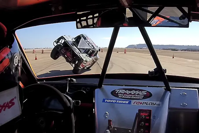 From cameras outside, as well as in the cab, you get a front row seat of the thrills and chills these two drivers gave the Coronado Speed Festival attendees with a two-wheel balancing act in their SST race trucks while negotiating a course laid out on one of the Coronado Naval Air Station runways.