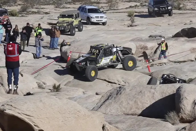 Once the team got into Johnson Valley, it was all business, and maybe a little pleasure. Jordan got his prerunner Wrangler out in the rocks, where rain affected the traction and made things sketchy. He gets a sense for what to expect when race day comes. Meanwhile, his crew takes a fine-tooth comb to his fully-independent-suspension race vehicle, which is a rare sight to see in rockcrawling motorsports.