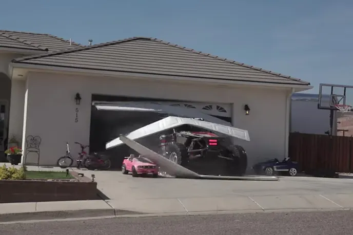 Loren is in the kitchen and as he closes the fridge he finds a note from his wife to pick up milk. He goes out to his garage and fires up his Ultra 4 vehicle only to have the garage door go haywire. Instead of trying to fix the door he decides to crash through it, destroying the garage door and the little pink barbie Mustang.