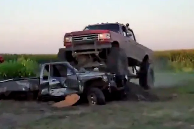 That’s what the video above is all about. The driver shown in the video has some fairly large rubber rolling underneath the reddish Ford Crew Cab he is piloting, and there is obviously quite a bit of suspension lift between the frame and ground, offering substantial ground clearance, and what would appear to be a solid chance of clearing the small pile of wreaked cars and trucks he is obviously bent on crushing and leaping over.