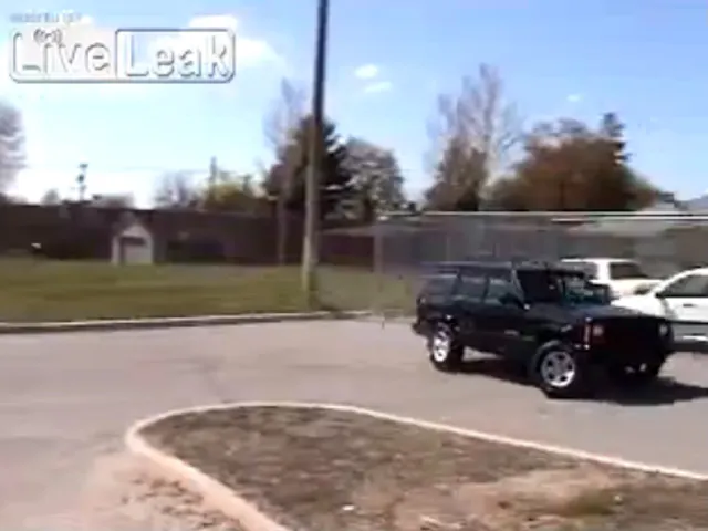 Piloting his XJ around a populated parking lot in an unknown location, the driver gets off to a lucky start. He’s able to keep his wheels pointed in the right direction, course-correcting before he gets too close to a curb, car, or other obstacle. At the 0:05 mark, he’s even able to pull off a dubious 180º whip-around, in what appears to be the most exciting of the stunts.