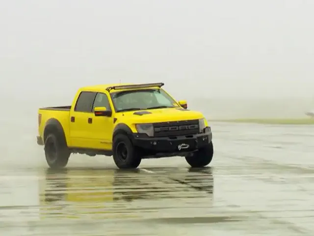 With that out of the way, watch the mysterious Stig thrash a Hennessey VelociRaptor 650 around that familiar old airport, drifting the thing through the corners on a soggy English day.
