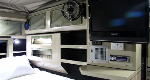 At the head of the trailer, you can fold out another full-size bed enclosed in a pop-up canvas room of its own for guests. This can also be helpful if more storage space is needed.