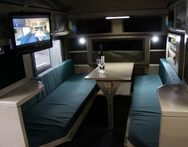 When you get to your campsite for the night, all you have to do is open the door of the trailer to find a ready-made double bed with plenty of storage areas along the sides. The bed can also be converted into two twin beds or transformed into an in-trailer dining area. According to Conqueror Australia, you can have your trailer outfitted with whatever luxuries you’d like, from a flat screen TV to a microwave oven.