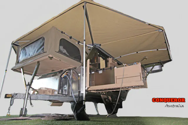 Camping while on a long off-road adventure is about your only option in most cases. Whether you prefer the tent-style sleeping quarters or the luxury accommodations that a RV would have, most of the battle is getting your gear to the off-road campsite of your choice. But with the UEV-490 off-road trailer from Conqueror Australia, the battle to get your sleeping quarters, bathroom features and even the kitchen sink wherever you’re going doesn’t seem like nearly the battle it could be.