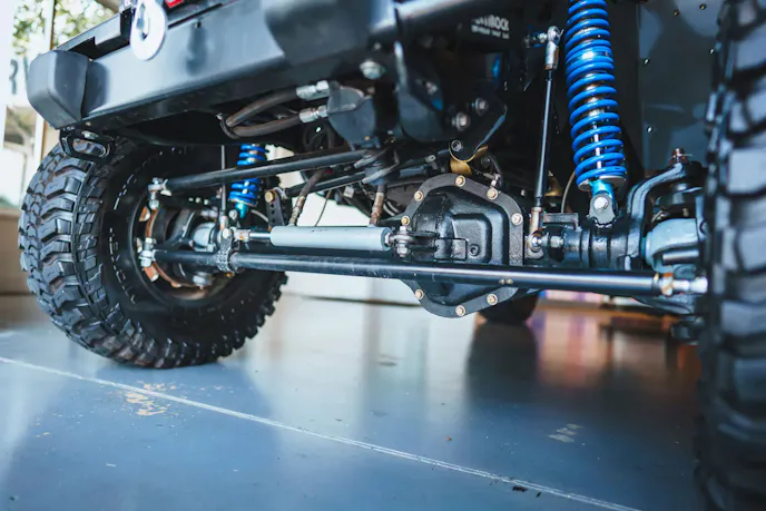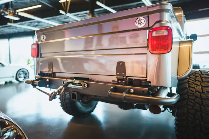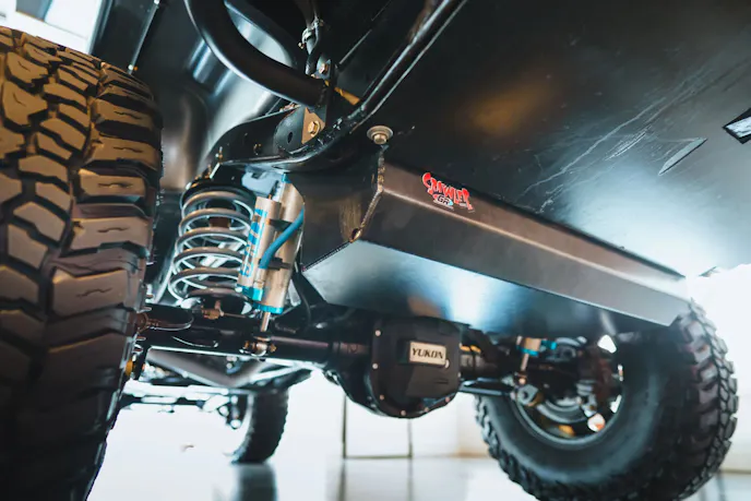 Up front is a Dana 60 front axle with Warn Premium manual locking hubs and out back is a Sterling 10.5-inch rear axle. Both axles have 5.13:1 gears and ARB Air Lockers. The Jeep’s suspension is a custom long-arm setup and includes King remote-reservoir coilovers and a Rock Jock 4×4 Antirock front swaybar.