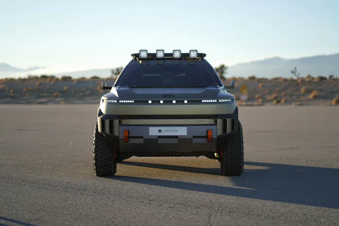 This language is expressed through a body shaped by the environments that inspired it. Chiseled bodysides, bold skid plates, and a planted, confident stance all work together to signal resilience and purpose. Built on a compact monocoque architecture with steep approach and departure angles, the CRATER Concept’s proportions suggest the ability to go nearly anywhere.