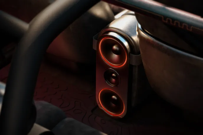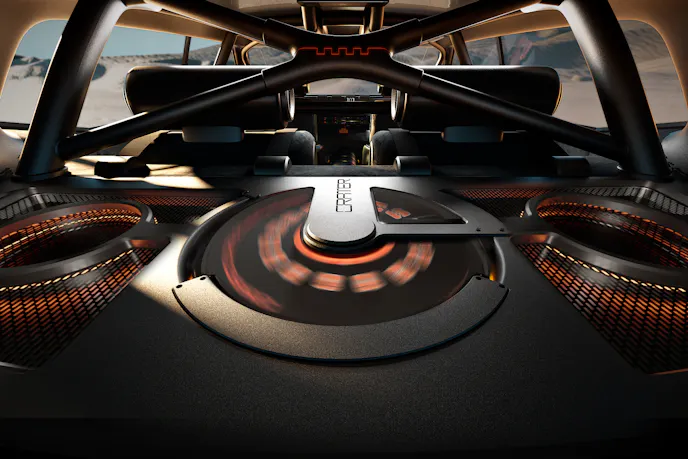 Functional details reinforce the CRATER Concept’s commitment to real use. Strap-inspired accents, ambient lighting, and structural elements create visual tension, while an exposed roll cage provides both safety and a sense of purpose-built integrity. Integrated grab handles make entering and exiting simple on uneven terrain.