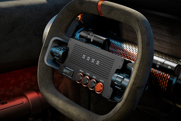 The seating is designed for active lifestyles, featuring wraparound forms, three-dimensional padding, cylindrical cushions, and pronounced bolsters for support during aggressive off-road driving. A four-point harness hints at the concept’s performance aspirations. The squared-off steering wheel incorporates a central pixel display and terrain-mode quick-select buttons for Snow, Sand, Mud, Auto, and XRT settings.