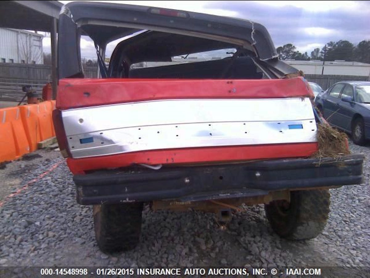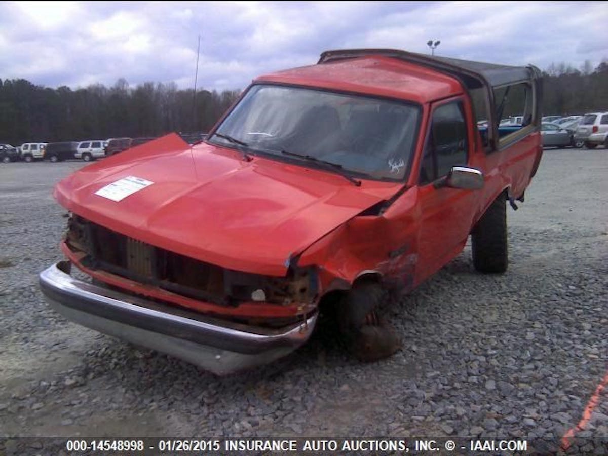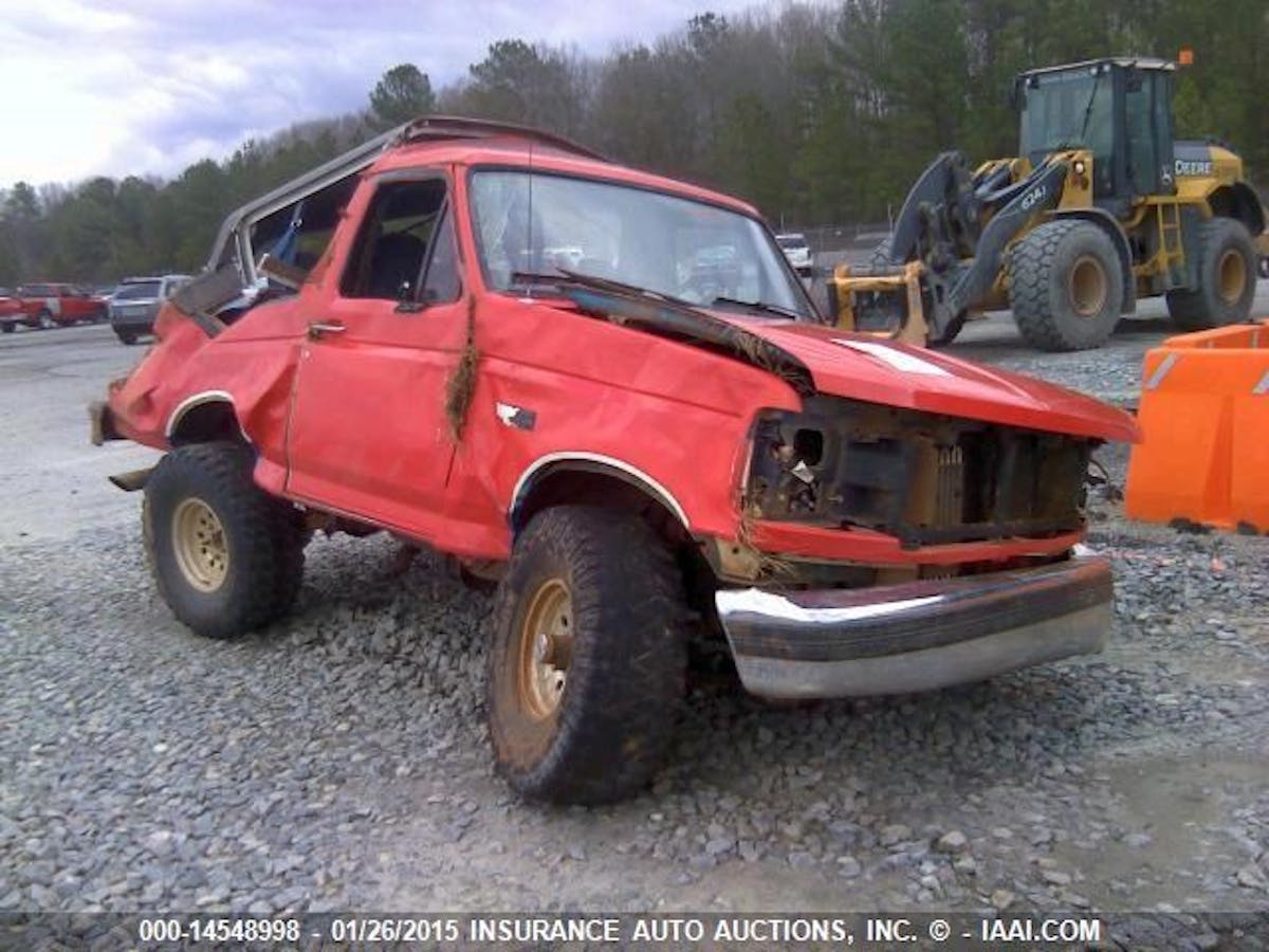 But holy cow, what a way to go. The faded red paint, classic holepunched wheels, and wide-treaded tires put the point across that the Bronco saw some use out on the trail before it wound up on the Insurance Auto Auctions (IAA) website. Well, that, and the chunks of scrub and soil help too.