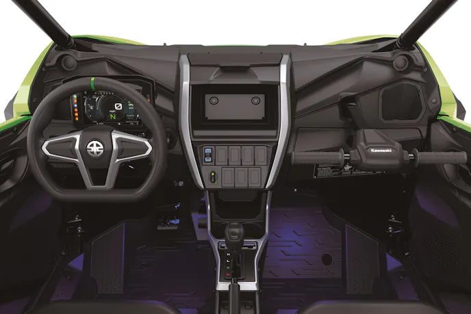 Interior fitment is automotive-grade: D-shaped steering wheel with tilt, molded door panels, generous legroom, and weather-resistant seating materials. “The roomy cockpit allows excitement to be shared with friends and family,” says Kawasaki. Each seat is purpose-built for sport riding with bolstered cushions and sliding adjustability.
