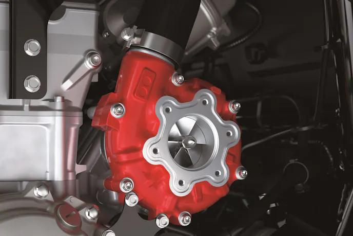 “The supercharged performance is harnessed by a continuously variable transmission (CVT) and a highly rigid frame complemented by long-travel suspension,” Kawasaki states. That CVT was specially designed to handle high-horsepower, high-heat output from this engine, featuring a 17.6mm rubber belt, an advanced cooling system, and a clutch engagement tuned for smooth but rapid acceleration.