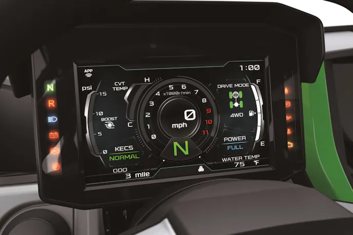 Kawasaki didn’t just drop in a big engine and call it a day. The driveline complements the power with Full, Mid, and Low Power modes (approx. 100%, 80%, and 60% output respectively), letting drivers tailor performance to terrain or skill level. A gate-style shifter provides fast selection between High, Low, and Reverse, while on-the-fly 2WD/4WD/diff-lock engagement lets you adapt instantly.