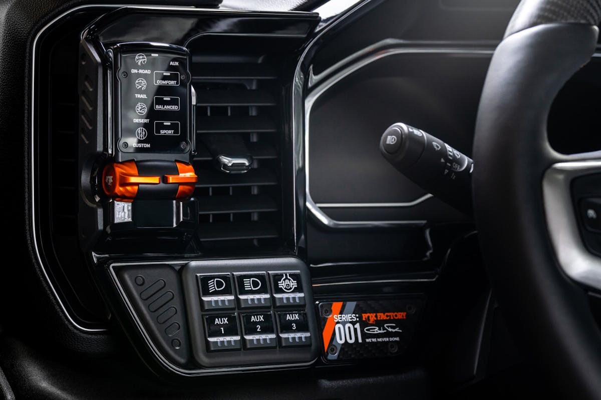 Inside, the truck’s power heated and cooled seats are refinished in custom orange stitched two-tone leather with Alcantara suede inserts and Fox Factory embroidery. The steering wheel receives a leather wrap as well along with an orange stitched center line, carbon fiber accents, and paddle shift integration. A Fox Live Valve control panel along with dash-mounted 6-switch relay system are installed. A serialized dash plaque provides the finishing touch.