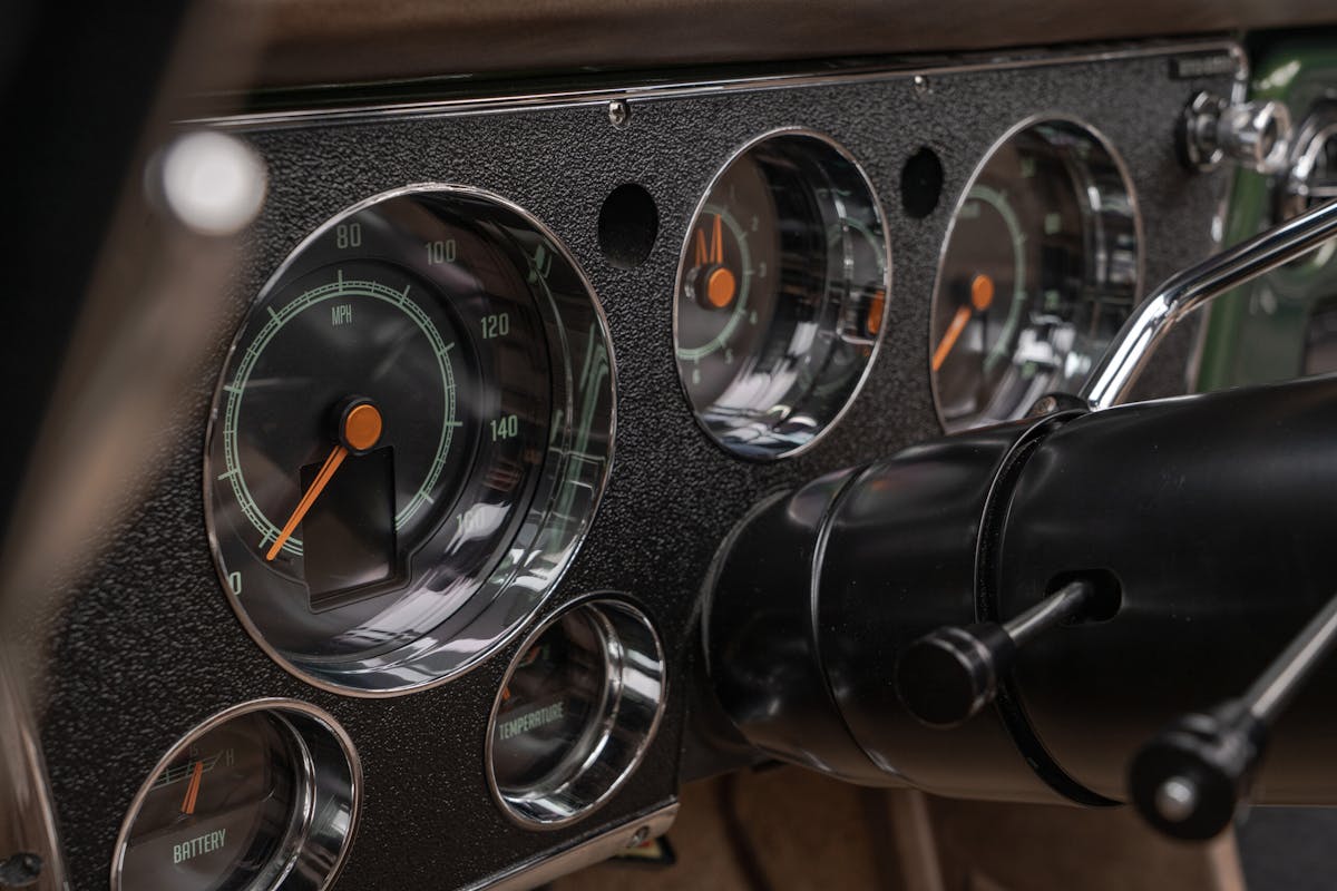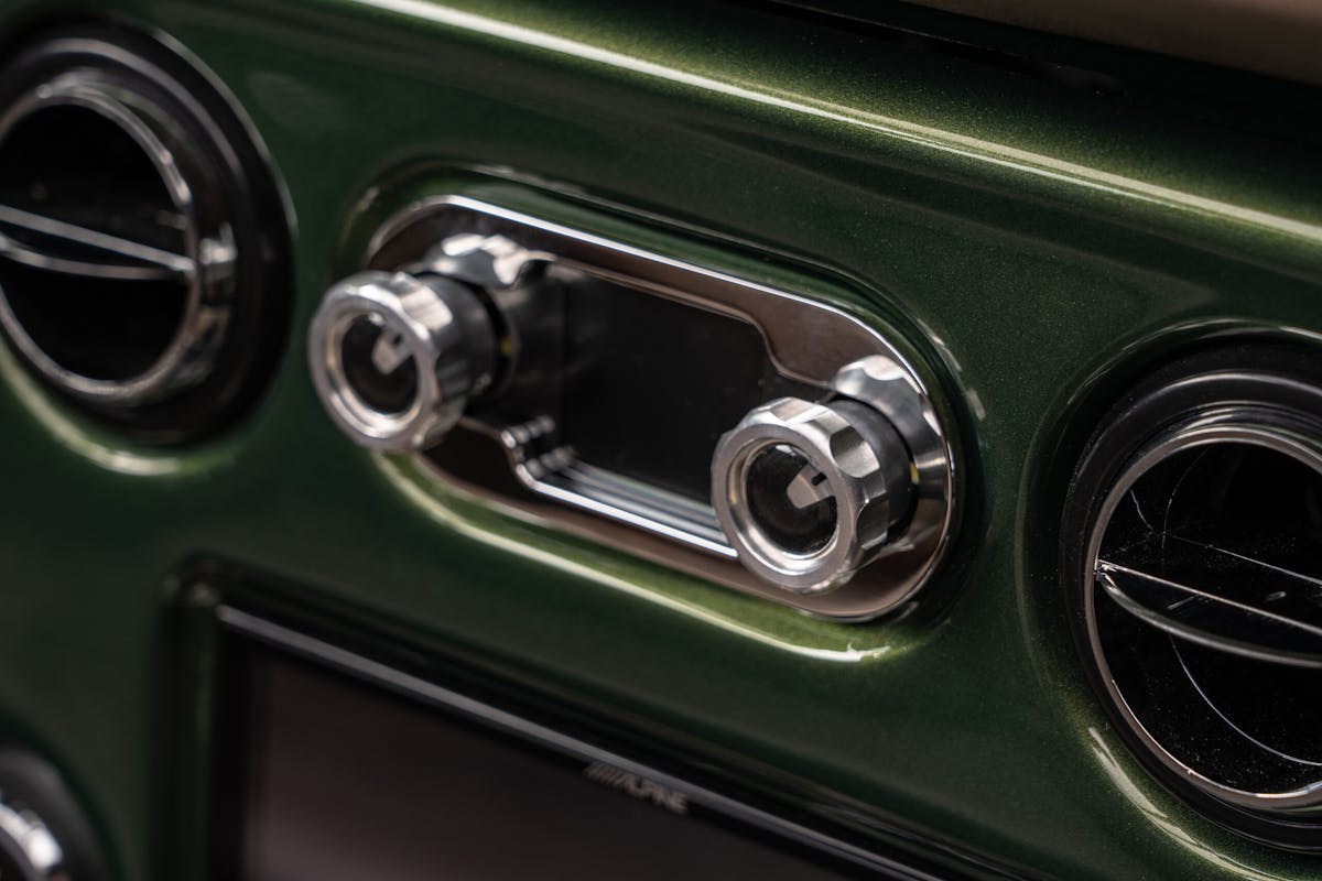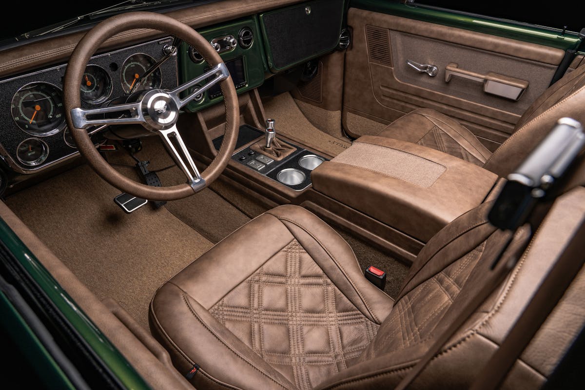 The interior of the Velocity K5 is more luxurious than a suite at the Renaissance Center. Color-matched upholstery, carpet, dash pad, headliner, and door panels create a vintage feel with high-quality custom materials. Procar bucket seats with a full rear bench provide plenty of seating to take all of your friends to the euchre tournament at Norte Dame Hall. Optional heated and cooled seats and a Vintage Air climate control system are an absolute must for 60-degree temperature swings when lake effect winds kick up. An Alpine head unit with Apple Car Play and Focal Audio speakers brings clarity to Grand Funk Railroad that passengers and nearby traffic will all enjoy.