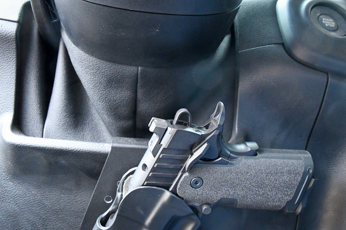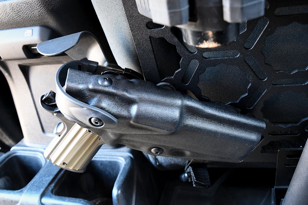 With the seat back finished, we turned our attention to the front of the Jeep. Having a pistol just arm’s length from the driver makes sense. We used the Gun Mount understeering column pistol mount and another Safariland holster to house the Prodigy 1911. This mount clips onto the plastic panel below the steering wheel and takes less than five minutes to install. It does an excellent job securing the firearm and is concealed much better than we initially thought.