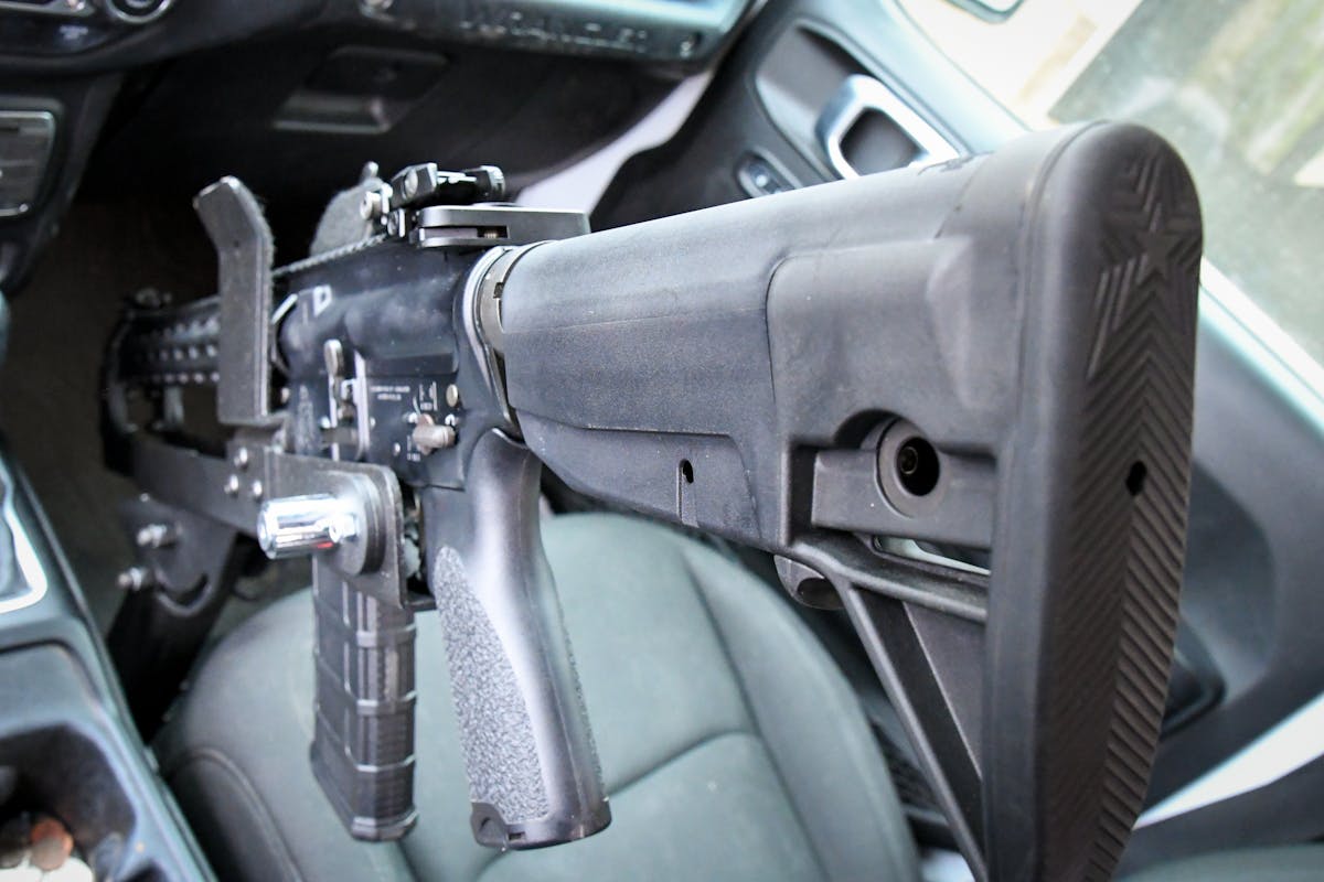 At this point, we have all firearms secured in the Jeep except the Saint AR-15. After some careful thought, we knew the weapon needed to be accessible by both the driver and passenger. With minimal options for this in a Jeep, we found the solution on gunmount.com. The company offers a front-seat AR rifle mount that secures and locks in an AR-15. Foutz said, “For the Gun Mount product, our most popular item is a hard split between our front seat AR rifle mount and our understeering column pistol mount.” The only question was, will the AR mount work in a Jeep?