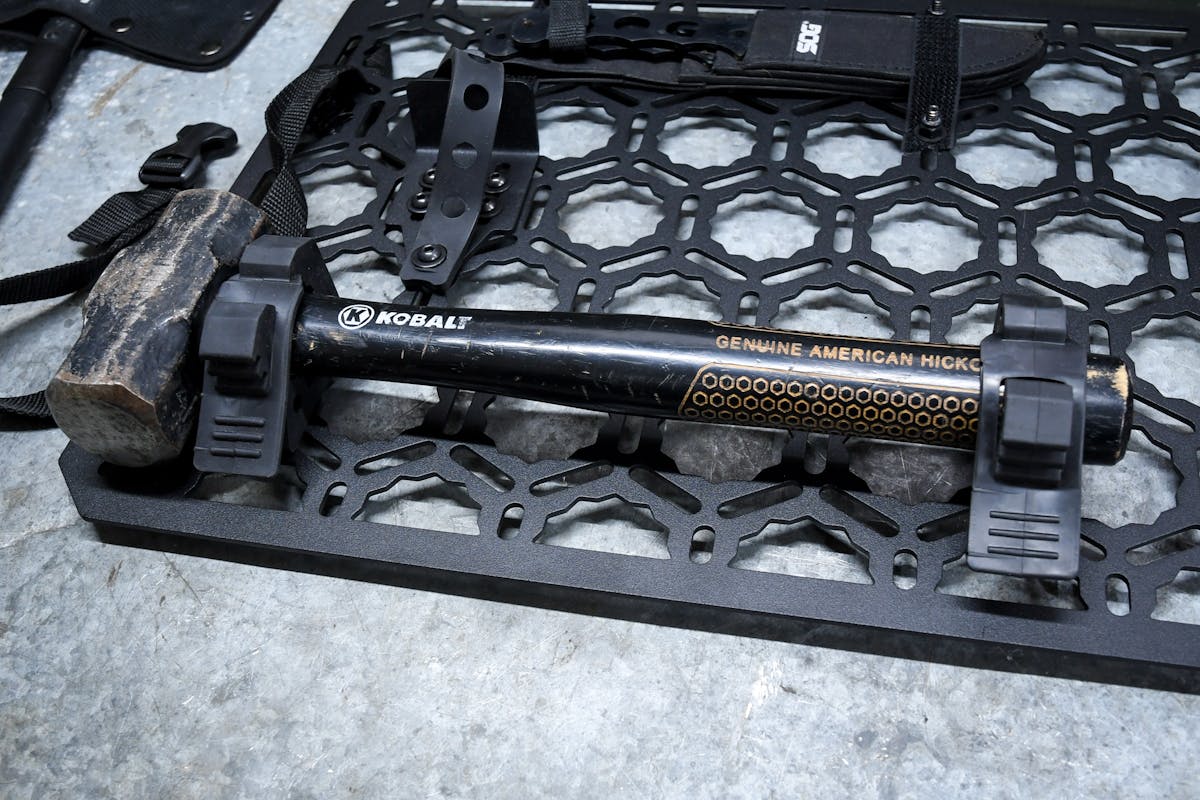 The panel behind the driver’s seat secures the Hellion rifle and SOG hatchet, and we still have room for a flashlight, gloves, and PMAG magazines for the long gun. On the back of the passenger’s seat, we decided to mount the SOCOM 16 rifle. The issue here is the gun is long, and the barrel hit the top of the Jeep. However, Adapt-a-panel offers a plate and base that lowers the weapon on the grid, thus freeing up the room we needed to make it work. We also added a set of SOG knives, a five-pound sledgehammer, and the 1911 Operator pistol. The 1911 is mounted so the driver or rear passenger can pull the gun when needed. The Safariland holster does a great job securing the 1911, ensuring the weapon will not move until required. We plan to add some more magazines and a few other survival necessities down the road.