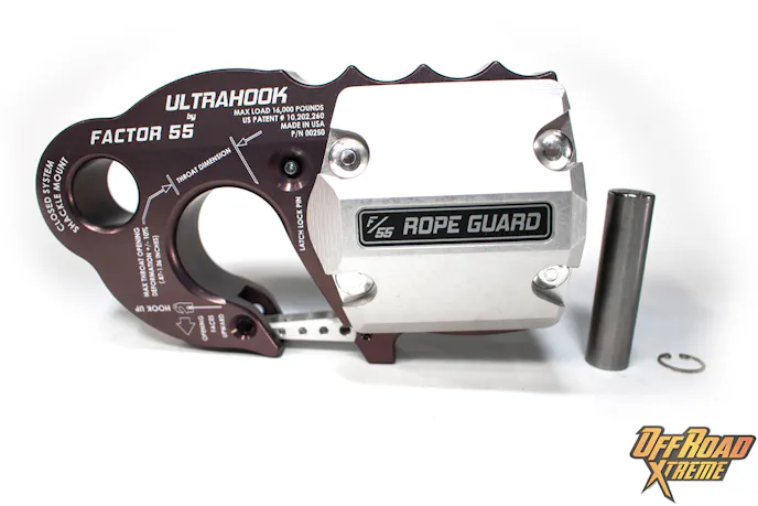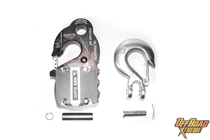 The standard winch hook by itself looks about as traditional as it gets. When sitting next to the Factor 55 unit, you realize how deluxe and impressive this UltraHook is. Designed for closed-system winching, the 32-ounce UltraHook has an integrated shackle pin mount. It is compatible with steel cables and synthetic winch rope. The max load has a 16,000-pound rating. Precision CNC machined using 7000-series aluminum, it features laser-etched guides.