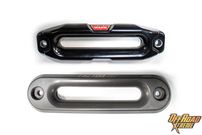 Factor 55 CNC machines the 1-inch thick Hawse Fairlead from USA 6000-series aluminum. The industry standard fairlead thickness is .75-inches thick. This Warn Hawse Fairlead is cast steel and powder coated. Our Factor 55 unit features a Type III hard-anodized coating for low friction contact and extended synthetic rope life.