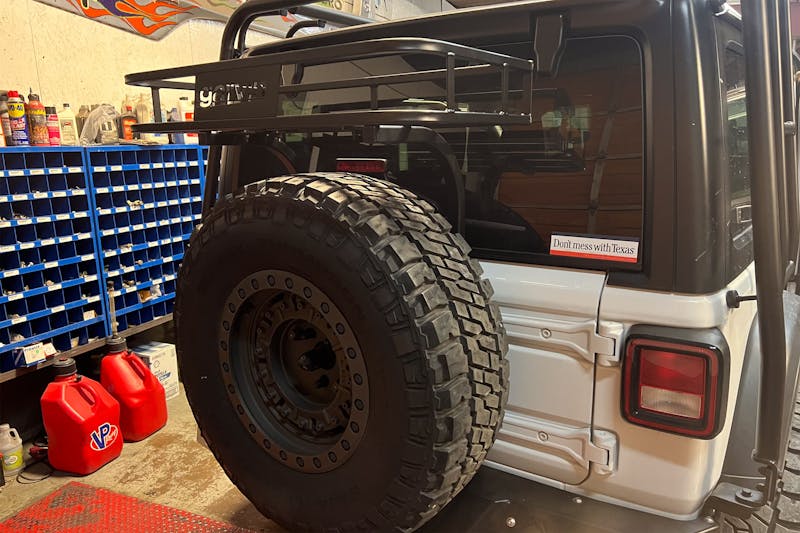 The Garvin Trail Rack is another cargo-expansion bonus we implemented, offering extra storage capacity at the rear. It’s ideal for carrying items that you don’t want inside the Jeep but still need to easily access. To add even more capacity and utilize interior space efficiently, we installed a very cool Garvin Rotopax Can Mount that affixes to the Jeep’s interior roll bar. It securely holds a Rotopax two-gallon water container. It’s worth noting that Rotopax containers come in various sizes and styles to carry things like water, fuel, tools, or food.
