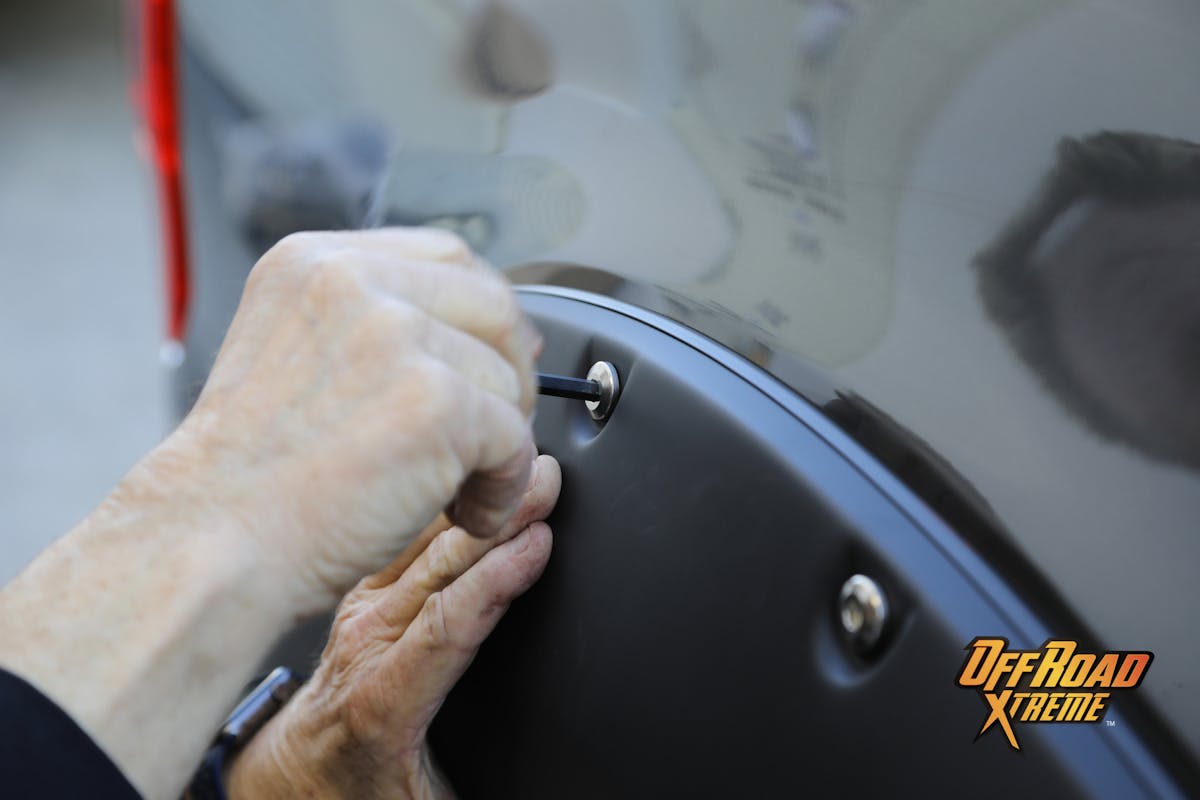 All of the plastic rivet fasteners and screws under the factory fender are removed but will be re-attached to the underside of the new fenders.
