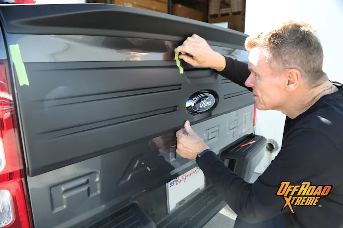 The tailgate applique for the Ranger was also mocked into position before it was adhered to the tailgate. This panel gives the Ranger the look of the Ford F-150 Raptor tailgate.