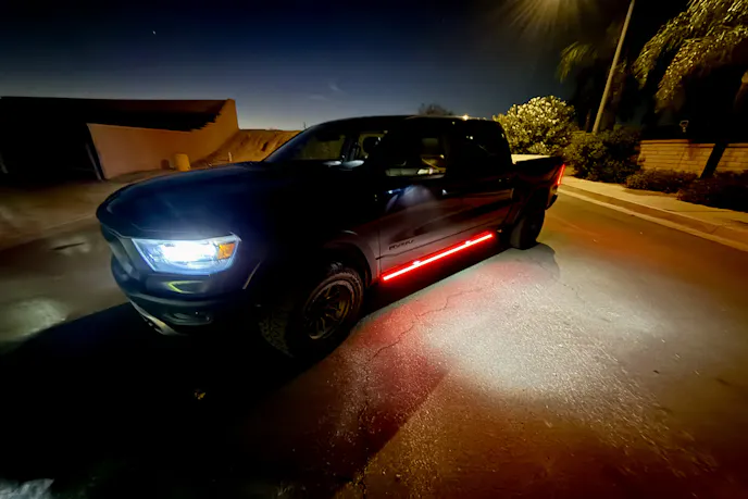 Here you can see our truck with the Vision running boards retracted. Using the AMP Research Smart Series smartphone app, we selected red accent lighting for this photo.