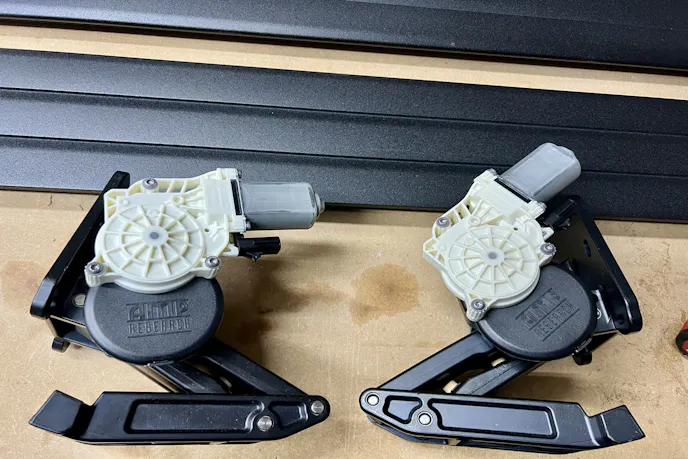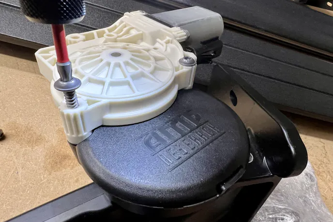 Each Vision running board has an electric motor that deploys and retracts the steps. Part of the installation process is bolting each motor to its motor linkage. You simply seat the motor into position on the three mounting bosses of the linkage, and then fasten it in place using the provided hardware. The first photo shows the motor linkage prior to motor install. The second image shows the motor being installed. The final photo shows the assembled driver- and passenger-side motor linkages, ready to be mounted to the vehicle.