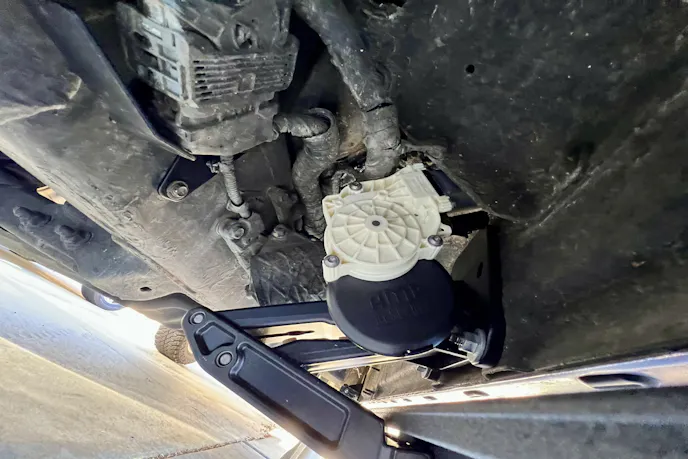 Here you can see one of the motor linkages installed on our truck. There’s no drilling involved to install the motor linkage or the non-motorized idler linkage because they use factory studs. Tip: There may be paint buildup on the factory studs, which will require cleaning before assembly. A wire wheel or thread repairing die will remove this buildup.