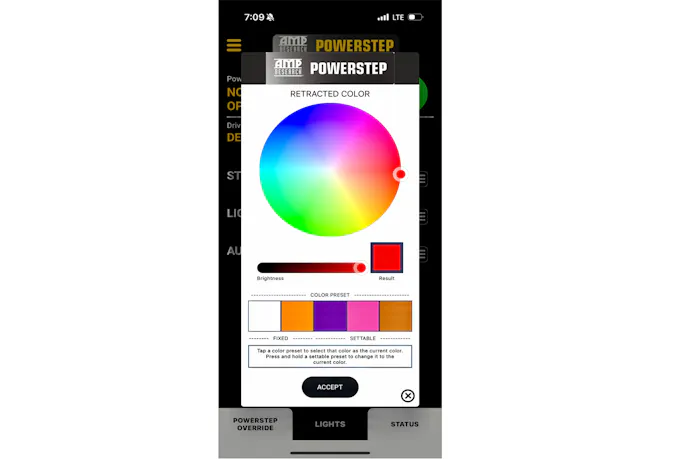 The AMP Research Smart Series smartphone app is available for iOS and Android smart devices. It allows you to monitor and control the Vision running boards. It also offers the ability to customize the LED lighting, and more.