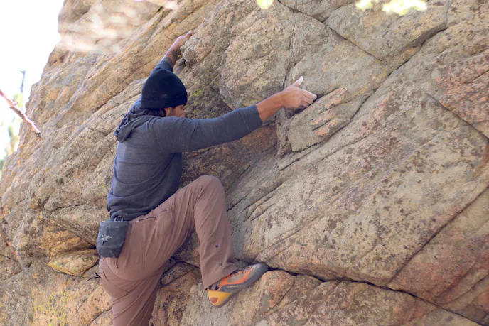 The following morning, breaking down our camp was relatively easy. We folded our inflatable mattress after deflating and rolled up our blankets, packed in our ice chest, threw our bicycles in the truck bed, and made for the trailhead to do some early-morning mountain biking and rock climbing. From the trailhead, we unloaded our bicycles and made our way up the mountain to the Nordic Base Boulder, where we did some light climbing.
