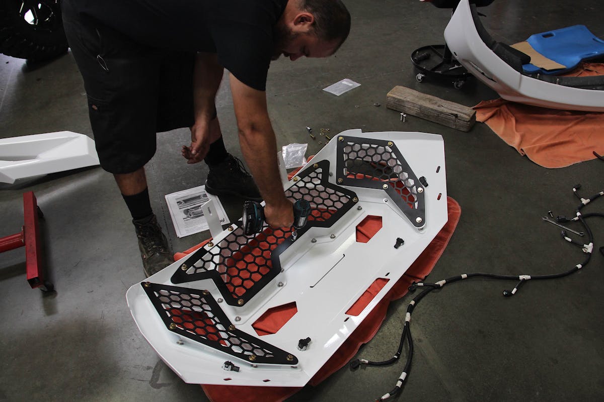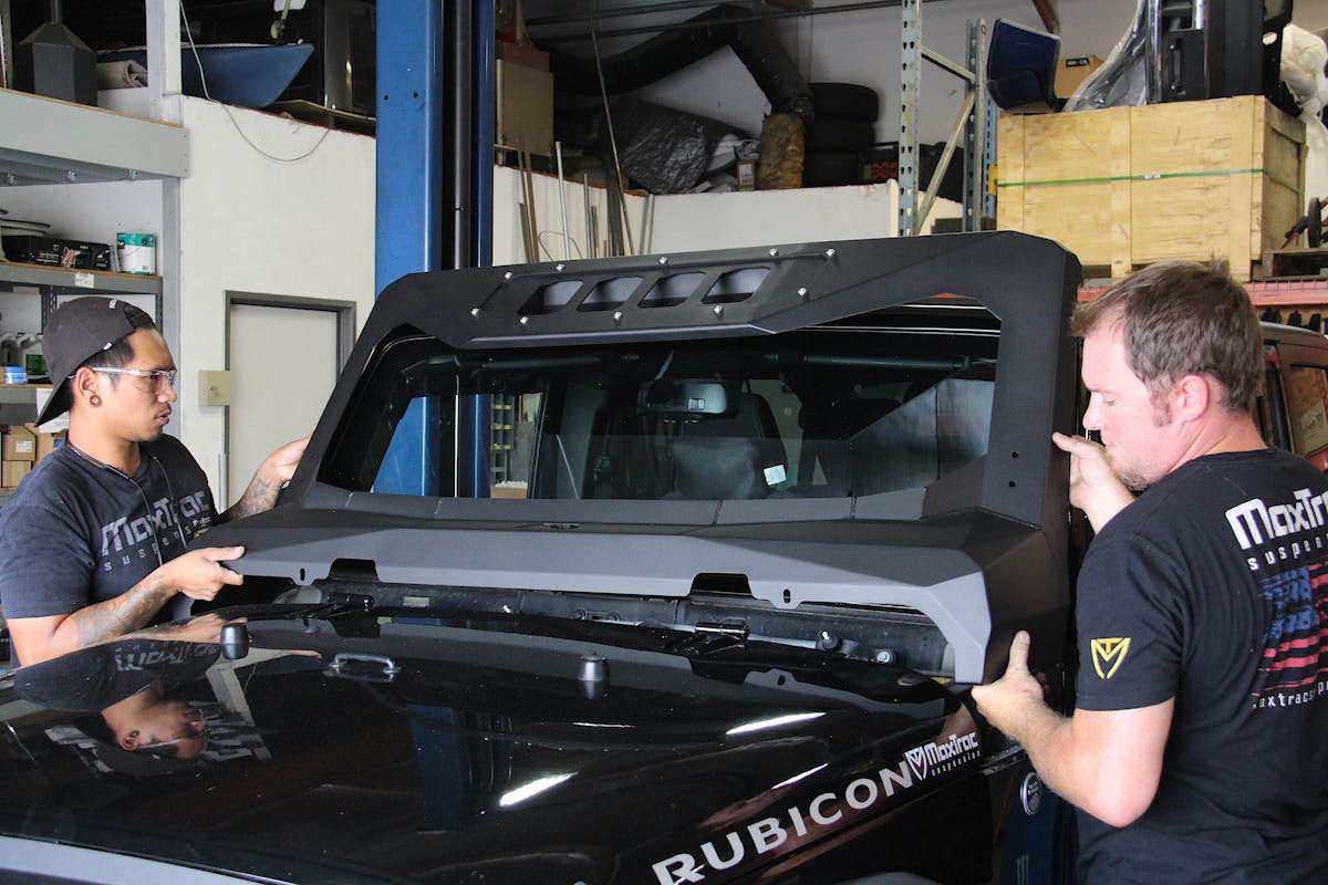 Next, we tackled the pre-assembly of the Jeep’s ViCowl. We used the visor trim, as the Jeep owner did not have lights at the time to install. With a few button-head cap screws, the trim went in. Over on the Jeep, the ViCowl windshield and under-hood brackets were installed using the factory hardware, but were kept loose so we could true everything up in the later stages.
