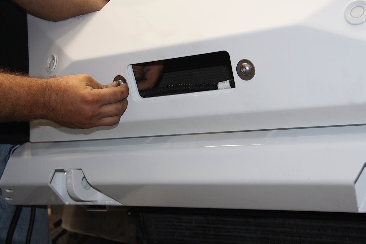 Next, the assembly of the grille began. We installed the mesh inserts into their proper places using flat washers, lock washers, and nuts to secure them to the Grumper. The parking sensors were also pushed into place on the Grumper, but we left them dangling without the epoxy, as that would come later.