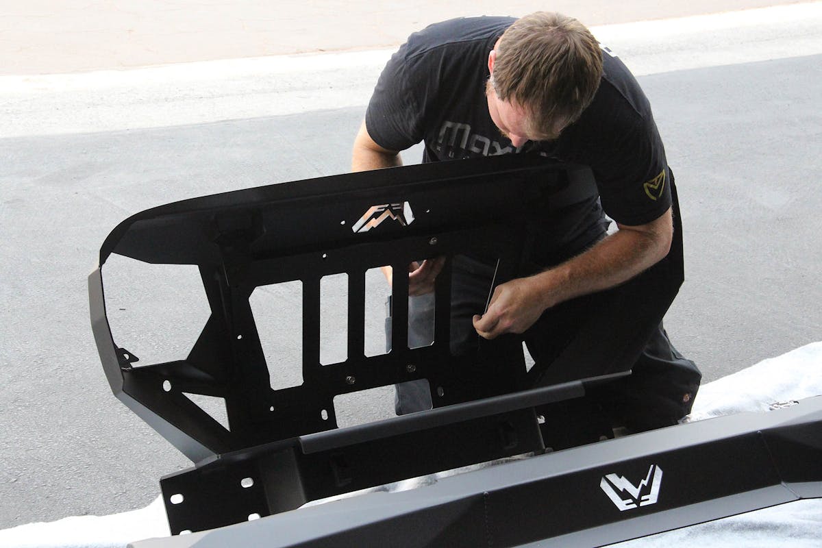 The Grumper then went onto the truck and was bolted down. The Grumper was nearly finished at this point, with the only things left being the wings. The wings bolted onto either side with four bolts, securing them to the center section and winch tray. Wing stiffeners were added for extra security as well. Finally, the parking sensors were re-installed onto the vehicle with epoxy, and that wrapped up the Grumper.