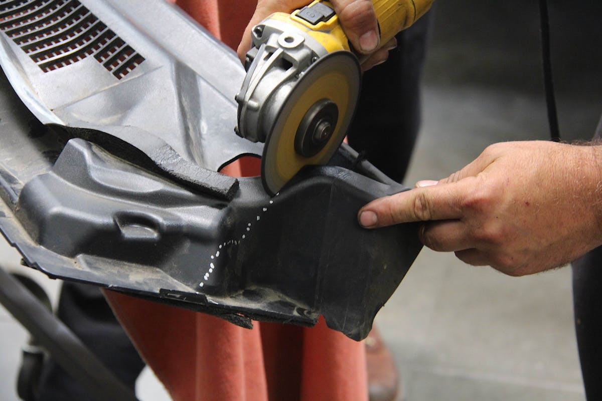 With a permanent marker, we made the marks on the cowl in accordance with the directions. The areas we were cutting off would inhibit the movement of the new hood hinges, so they had to go. We used a cutoff wheel and trimmed the plastic to its proper specification.